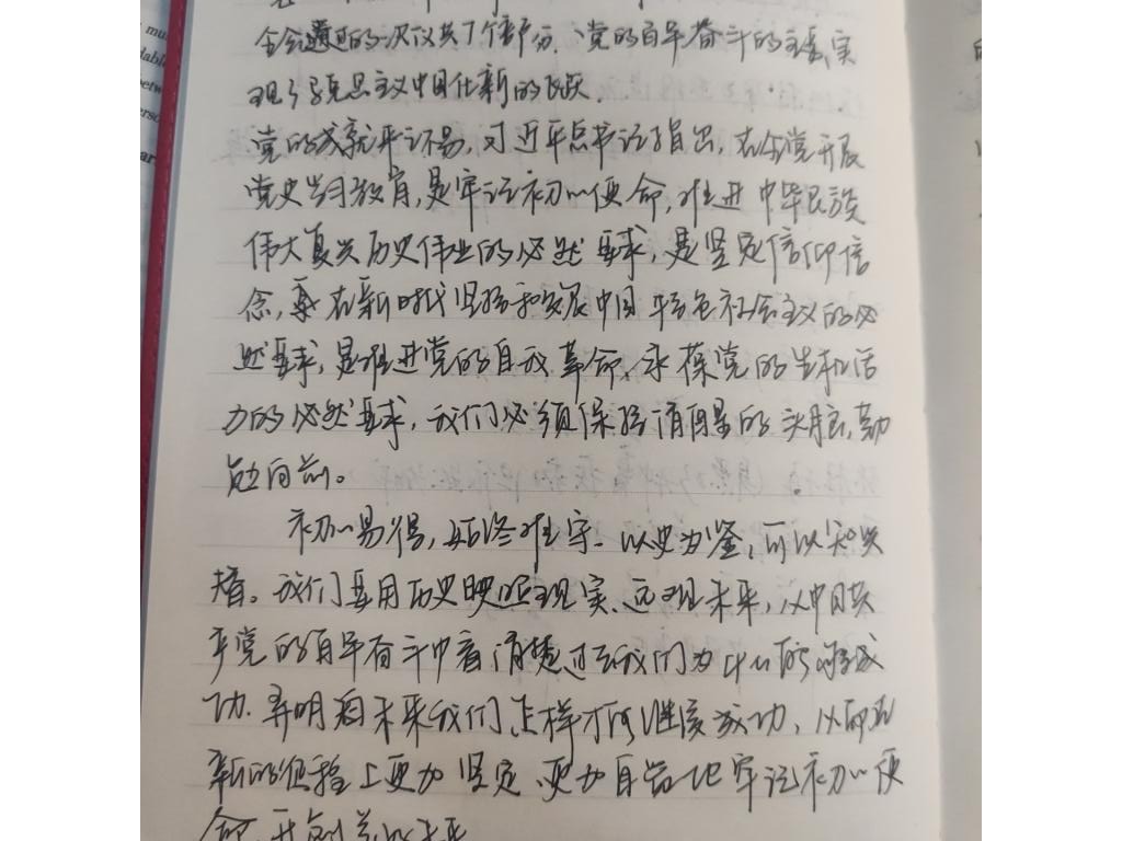 奋斗新征程,赶考无穷期。中华民族伟大复兴是一场接力跑,需要一代又一代人为之继续奋斗。通过此次专项活动,支部中的学生党员们对党的百年奋斗重大成就和历史经验的决议有了切身的体会和发自内心的感触,在他们的观后感中写道:“初心易得,始终难守。以史为鉴,可知兴替。”在这样一个机遇与挑战并存的时代,新时代青年需要在危机中寻找先机,在变局中探索新局,继续发挥党员先锋带头作用,在集体中发挥光热。
