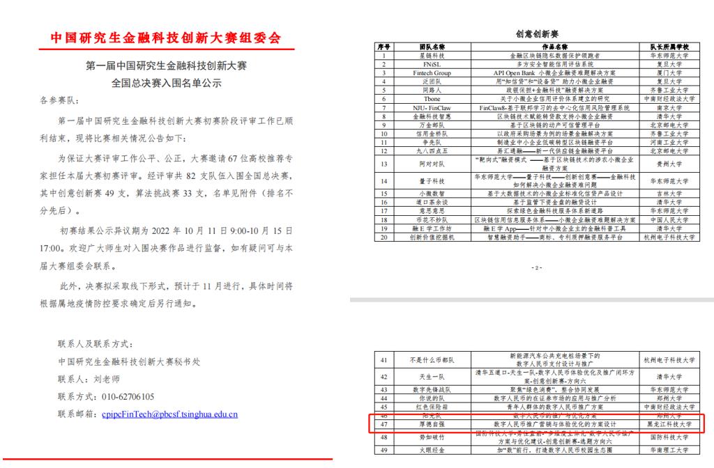 近期,第一届中国研究生金融科技创新大赛初赛阶段评审工作顺利结束。经过初赛评审,共有来自46个高校的82支队伍闯入全国总决赛,其中创意创新赛49支,算法挑战赛33支。