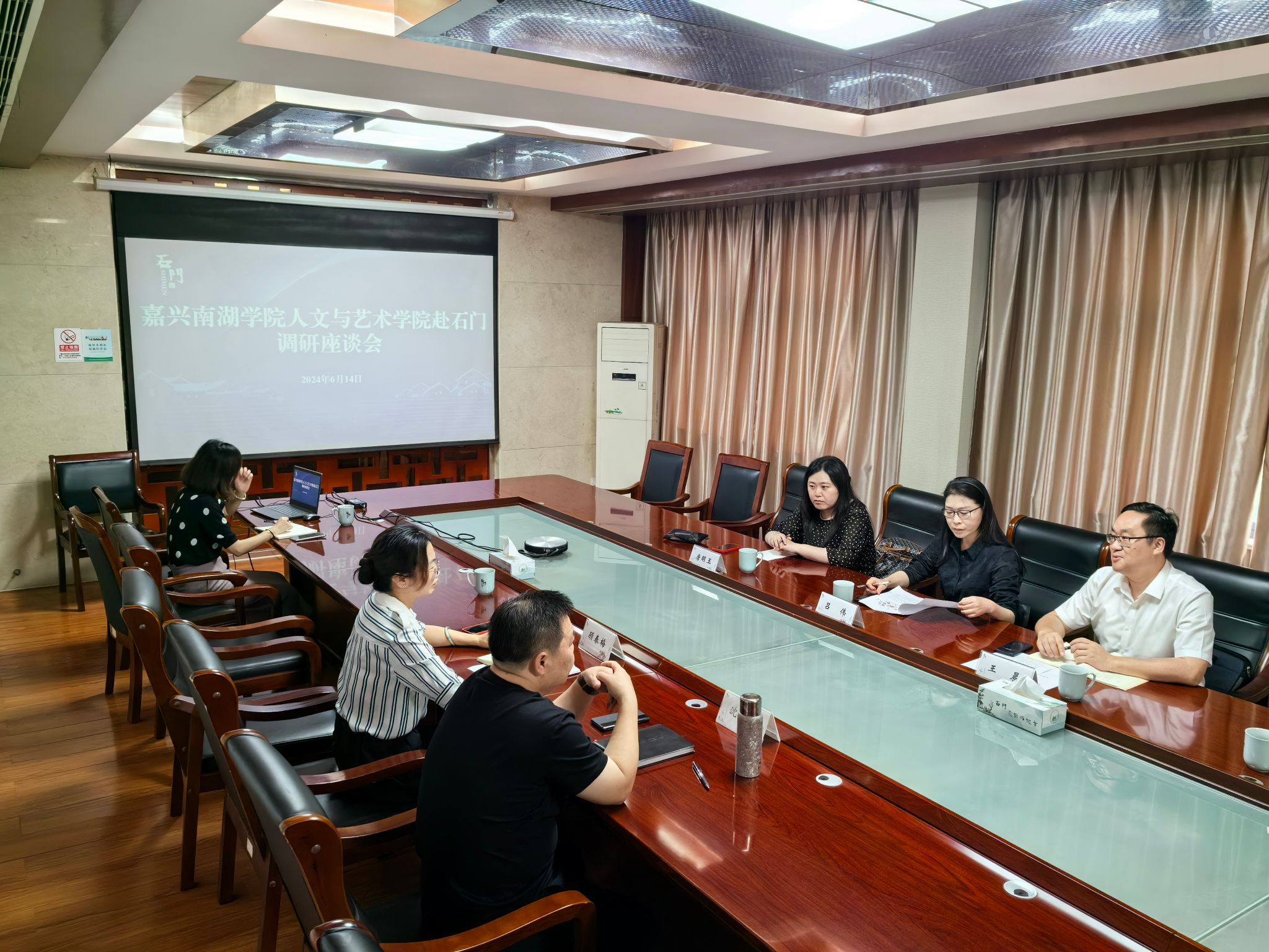 6月14日下午,Beat365亚洲版官网入口党委书记王晨、社会合作与国际交流处副处长吕伟,带领新文科综合改革基地研究人员一行4人,前往嘉兴市桐乡石门镇考察交流。石门镇党委书记沈其芳、副书记顾春梅等热情接待了Beat365一行。