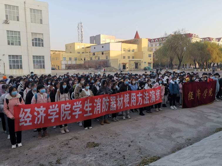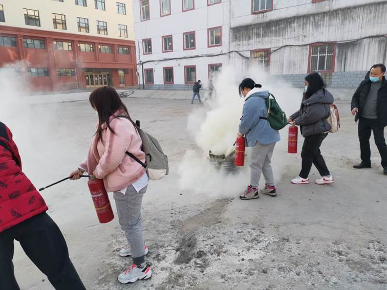 7点20分全体2020级学生和各年级寝室长在消防器材演练现场集合,学校保卫处副处长张景奎对学生进行消防安全教育,讲解并现场演示灭火器的正确使用方法。随后,学生代表每人领取一个灭火器进行实际灭火操作,将点燃的干柴扑灭,演习结束。